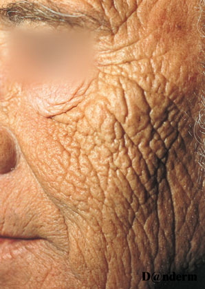 - I den øvre del af ansigtet ses rynker i panden og omkring øjnene i starten kun ved aktive muskelkontraktioner, men efterhånden bliver de statiske og dybere og ses i hvile