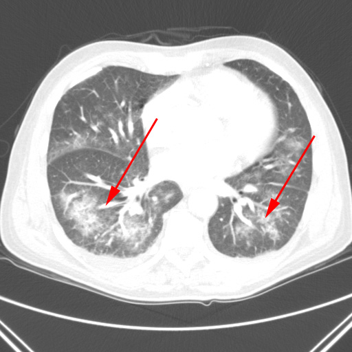 To CT-skanninger af lungerne på samme patient. Først er det øverste billede taget og 6 dage senere tages billedet neden for. Patienten udvikler lungebetændelse, som fremstår som hvide områder i lungerne på billedet neden for (røde pile).