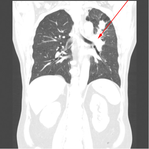 Røntgen (oven for) og CT-optagelse (neden for) af den samme patients lunger med få dages mellemrum. Begge billeder viser stor lungetumor i venstre overlap (røde pile).