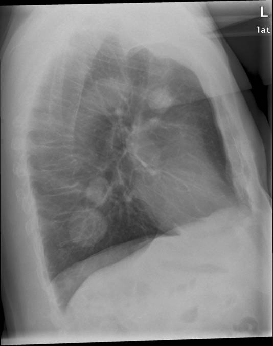 Røntgenundersøgelse af thorax som viser rundinfiltrater i begge lunger. Det skyldes kræftspredning til lungerne, såkaldte metastaser.