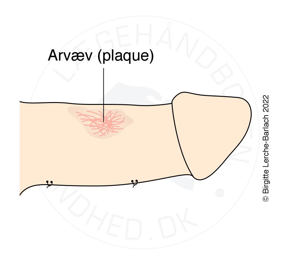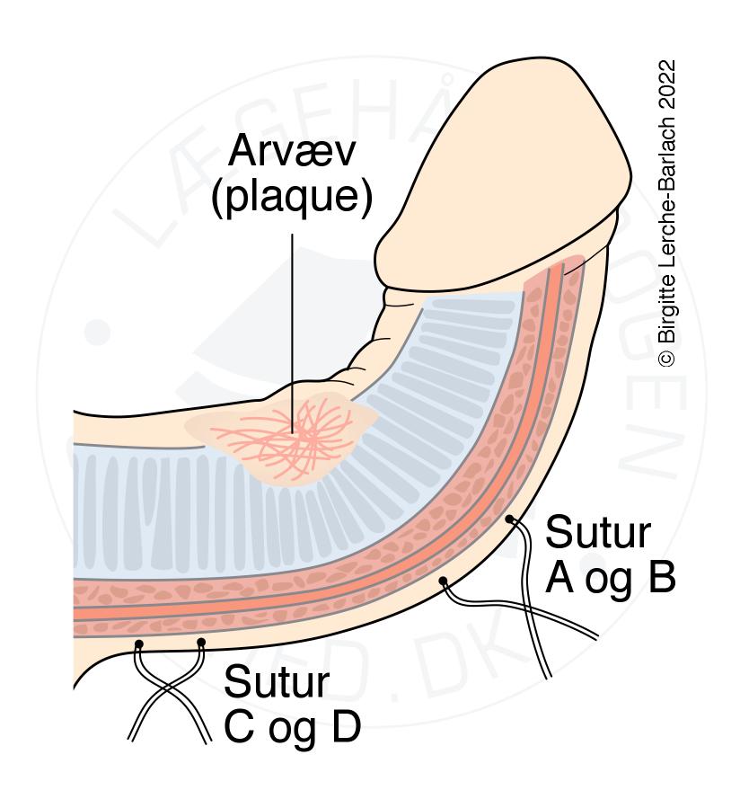 Ueftergiveligt plaque typisk doesalt i corpora cavernosa danner udgangspunktet for krumning under erektion. Krumningen ophæves typisk med plikering på konveks side (f.eks. Nesbits procedure), men ofte med en forkortelse af penis.