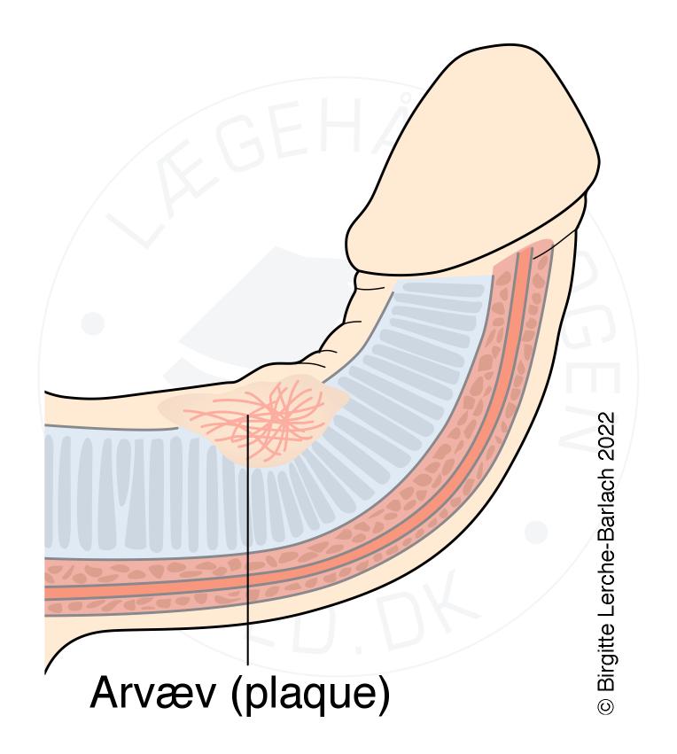 Initalt ømt inflammatorisk plaque i corpora cavernosa heler op under fibrosering, nedsat vævselasticitet og dermed udgangspunktet for krumning under erektion.