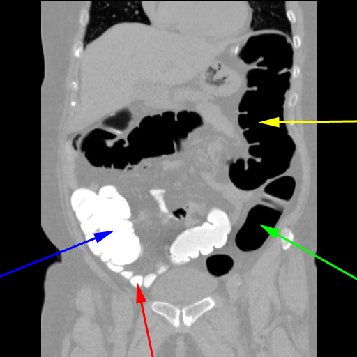 CT-kolografi. Koronal rekonstruktion af de mange tværsnitsbilleder der blev taget, mens patienten lå på ryggen. Man ser, at coecum (blå pil) og terminale ileum (rød pil) er kontrastfyldte, men colon sigmodium (grøn pil) og colon descendens (gul pil) er luftfyldte.