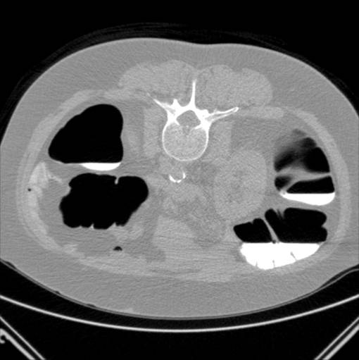 CT skanning af abdomen med henblik på fremstilling af tyktarmen (colon). Et af mange billeder. Patienten ligger på ryggen.