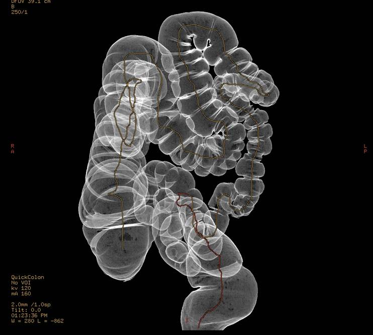 3D fremstilling af normal tyktarm i forbindelse med CT-kolografi.