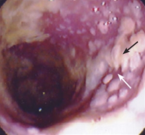 Viser gulgrå pletvise fibrinøse membraner (pseudomembraner), som dækker tarmvæggen ved de alvorligere tilfælde