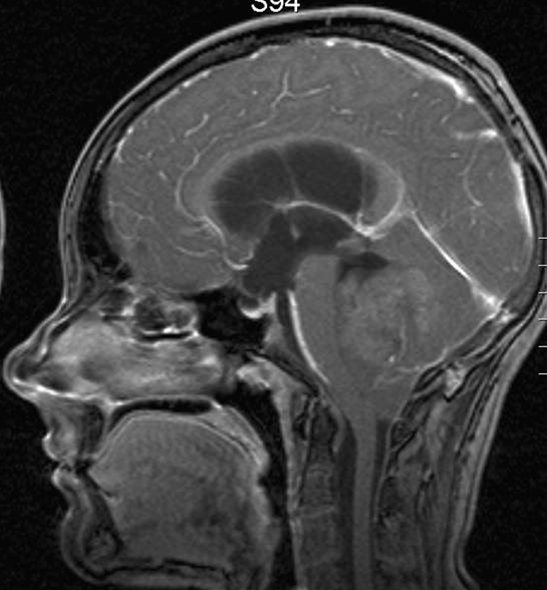 MR-scanning viser et medulloblastom i 2 vinkler (axialt, sagittalt)