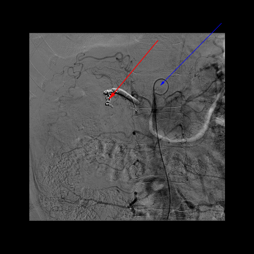 Billedet viser en aflukning af blodforsyningen til nyretumor (embolisation). Der lægges coils (rød pil) i pulsåren til tumoren, hvorefter den ikke ses. Kontrasten er sprøjtet ind via et kateter (blå pil).