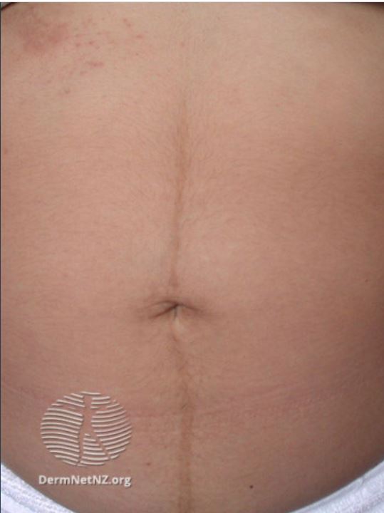 Foto af friske striae på abdomen. Stria gravidarum, foto venligst udlånt af dermnet.