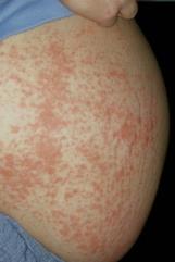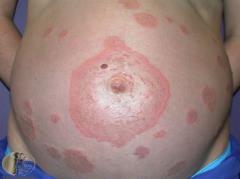 Debuterer i 3. trimester med intens kløe på abdomen med udbrud af urticarielle plaques og papler typisk svarende til striae