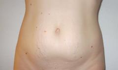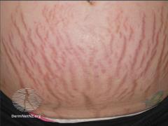 Foto af friske striae på abdomen. Stria gravidarum, foto venligst udlånt af dermnet.