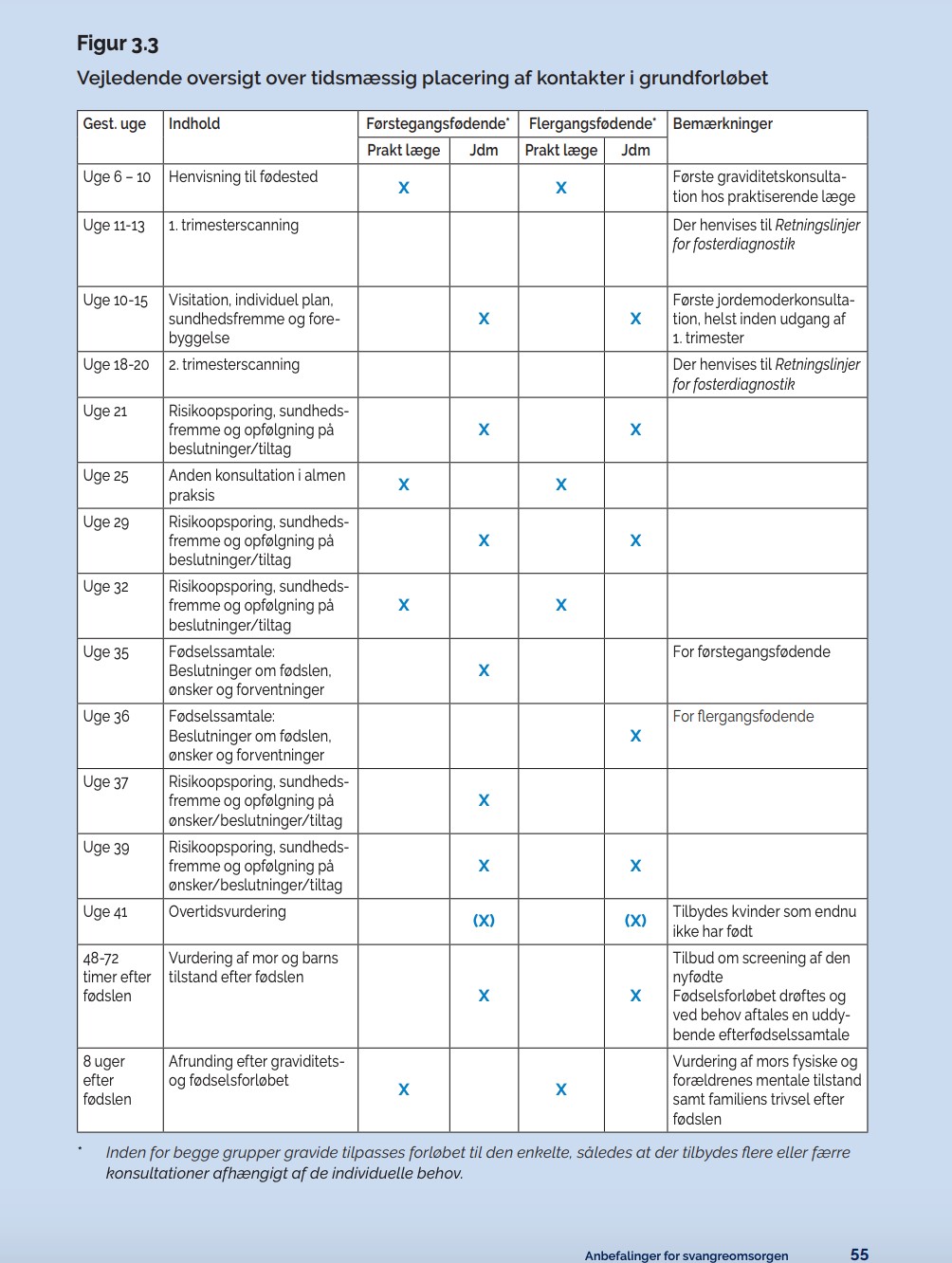 Med udgangspunkt i den raske førstegangsfødende kvinde med en ukompliceret graviditet er antal og tidspunkter for kontakter vist i tabellen nedenfor