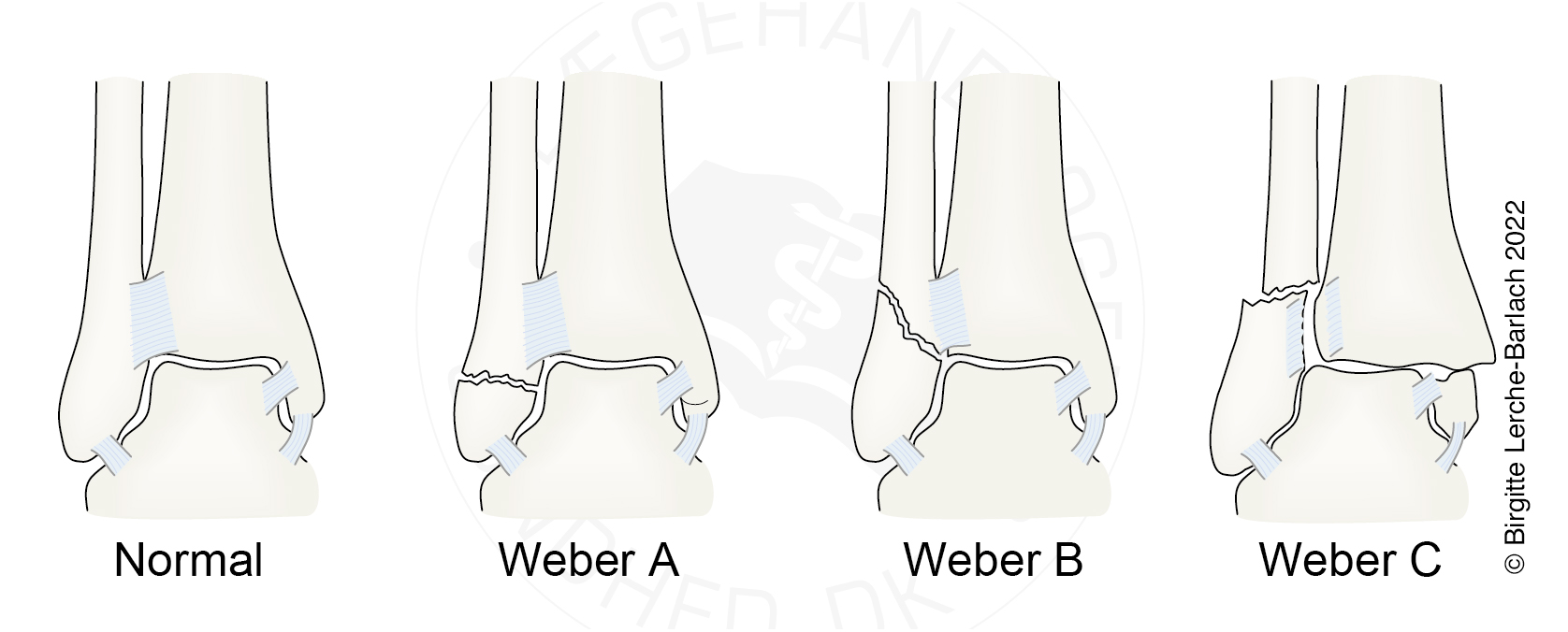 Ved type A sidder frakturen i laterale malleol under talocruralleddet og syndesmosen er intakt. Ved type B sidder frakturen på niveau med talocruralleddet men syndesmosen er intakt. Ved type C sidder frakturen over talocruralleddet og der er syndesmoseruptur – på illustrationen er der også fraktur af mediale malleol med subluksation af ankelleddet fordi frakturen er ustabil.
