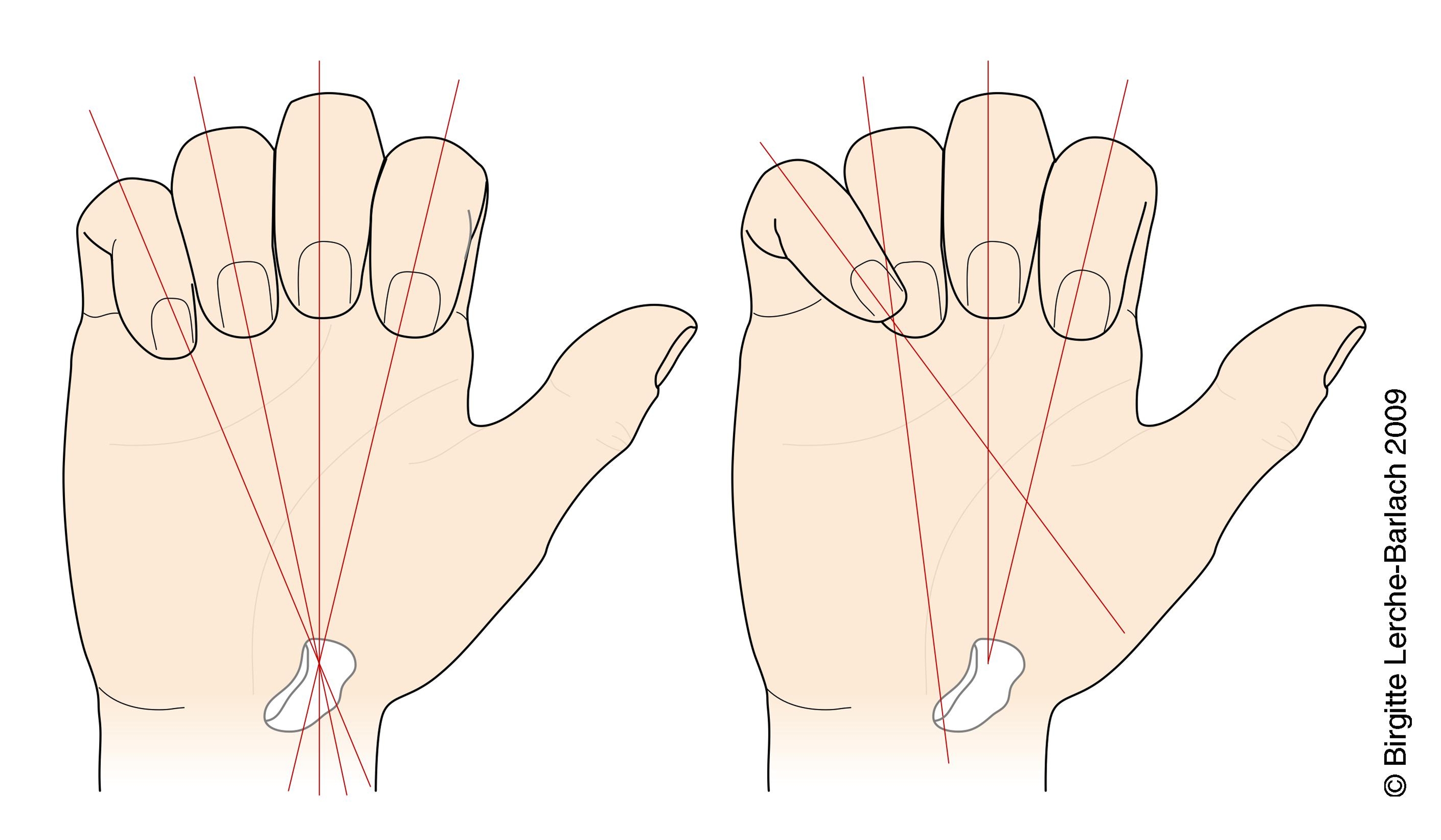 Der ses efter rotationsfejlstilling. Dette undersøges sikrest ved at se, om fingrene ved fleksion peger mod bådbenet, og ikke kommer i konflikt med hinanden ved fleksion, bemærk retningen af fingerneglene