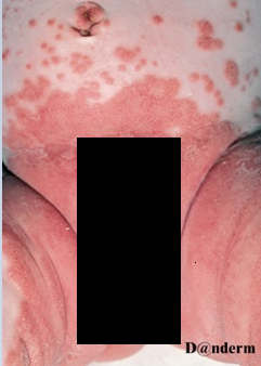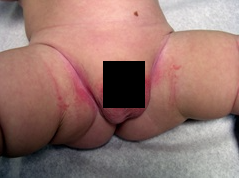 Foto af spædbarn med mere udtalt seborhoisk eksem, såkaldt Jadassohns sebopsoriasis i bleregion.Foto venligst udlånt af DermNet
