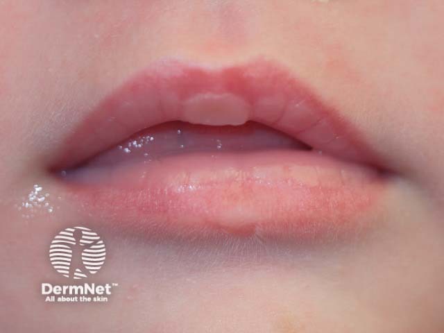 Foto af sutteblære på overlæben. Foto venligst udlånt af DermNetFoto venligst udlånt af DermNet