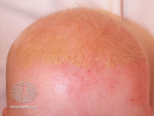 Foto af issen på spædbarn med seborrhoisk eksem på issen, såkaldt arpFoto venligst udlånt af DermNet