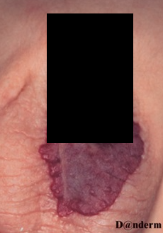 Foto viser eksempel på infantilt hæmangiom på scrotum.Foto venligst udlånt af DermNet