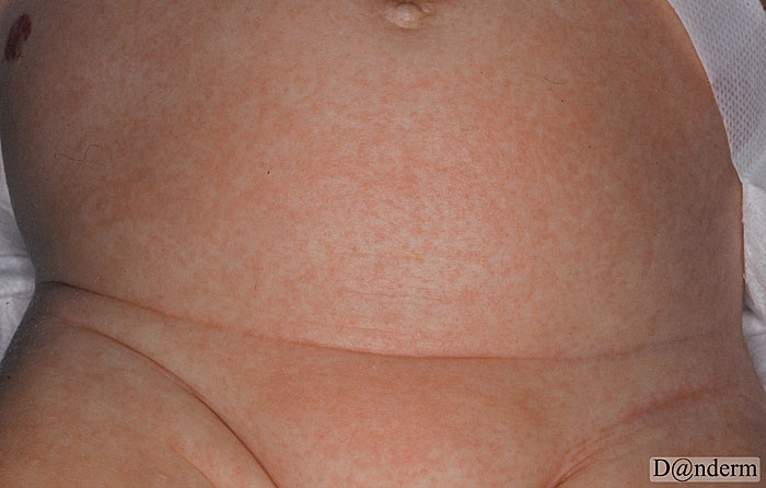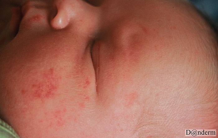 Foto af babykinder med udslættet erythema toxicum neonatorum. Foto venligst udlånt af DandermFoto venligst udlånt af DermNet
