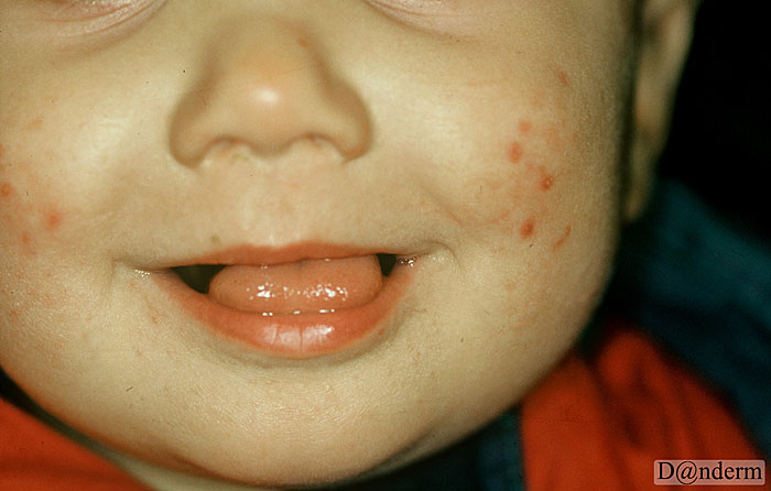 Foto af Neonatal pustulær melanose på kinder og ansigtFoto venligst udlånt af DermNet