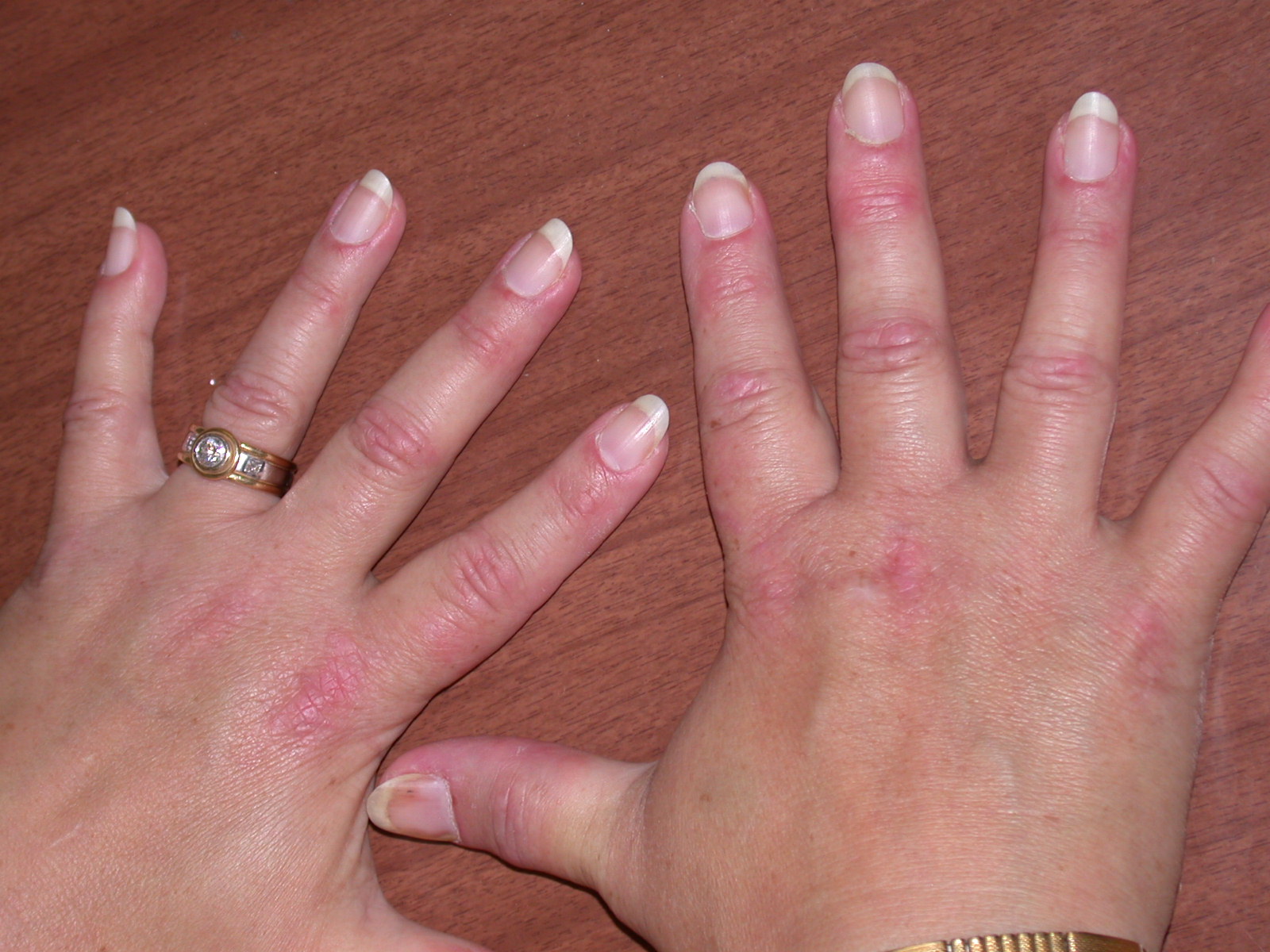 Er blåviolette papler, som er lokaliseret symmetrisk og dorsalt over fingerled (MCP, PIP og/eller DIP led)