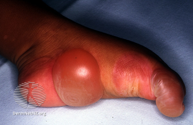 Ofte blæredannelse, også i de indre organer, især i urinveje