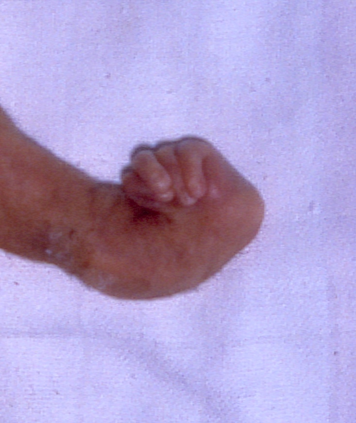 Knyttede hænder med overliggende fingre (anden finger over tredje, femte over fjerde), mangelfuldt udviklede negle