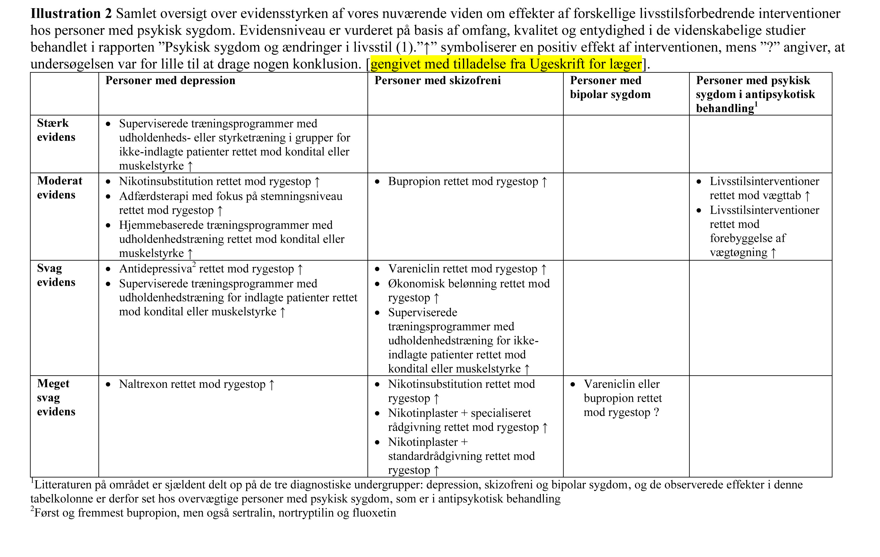 En samlet oversigt over evidensstyrken af vores nuværende viden om effekter af forskellige livsstilsforbedrende interventioner hos personer med psykisk sygdom fremgår af illustration 2 herunder
