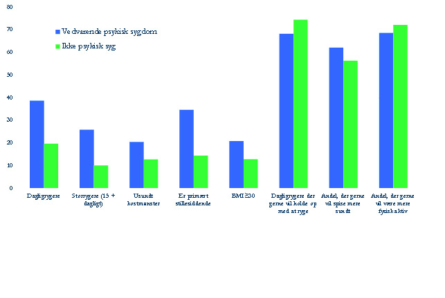 Landsdækkende tal fra Den Nationale Sundhedsprofil 2010 dokumenterer således, at personer, der angiver at de har vedvarende psykisk sygdom, dobbelt så ofte har et usundt kostmønster (20,9 % vs. 12,9 %), en stillesiddende adfærd (34,7 % vs. 14,5 %) og er daglige rygere (38,8 % vs. 19,8 %) i forhold til den generelle befolkning. Der er også langt flere storrygere (25,9 % vs. 10,1 %) og svært overvægtige (20,9 % vs. 12,9 %)