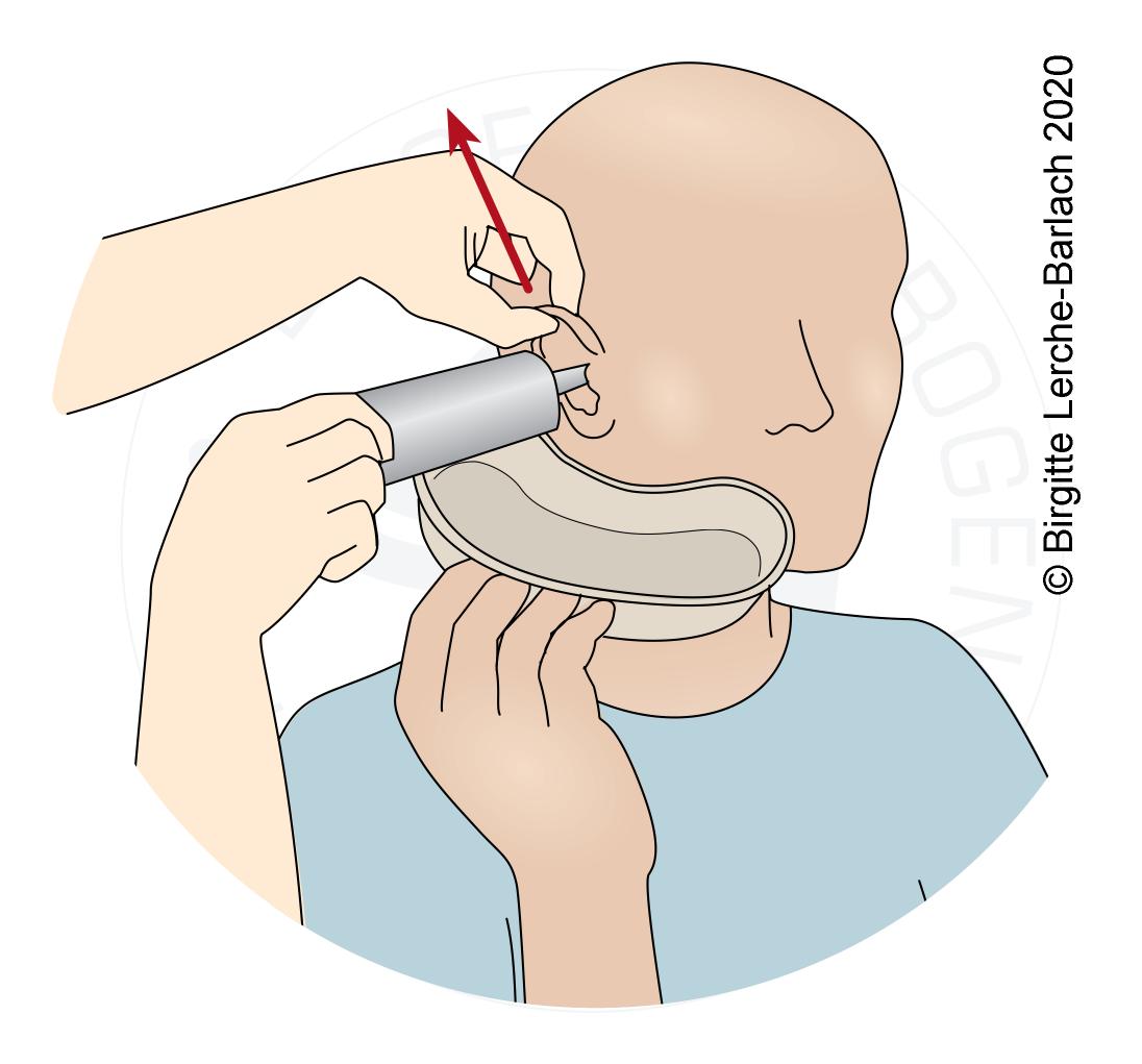 - Ret strålen i øregangen bagud/opad, ofte skal strålen have lidt kraft på for at have effekt, NB: Skyl ikke for kraftigt